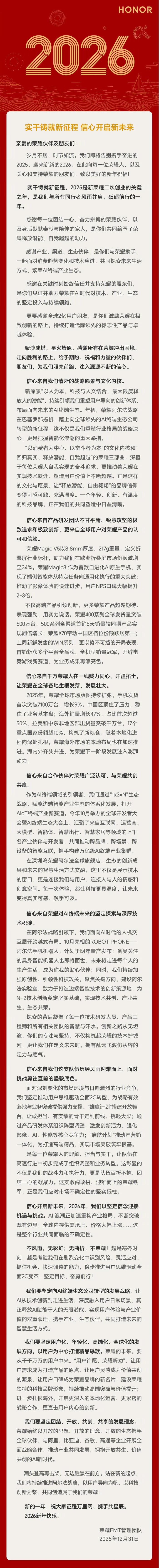 12月31日,荣耀EMT管理团队发布了题为“实干铸就新征程,信心开启新未来”的新年致辞,回顾了其在2025年作为“二次创业关键之年”的发展历程与成就,并展望了2026年作为“AI终端生态公司”的战略目标。