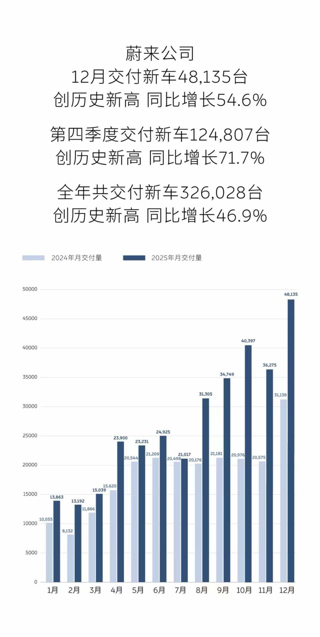 2025年全年,蔚来公司共交付新车326,028台,同比增长46.9%,创历史新高。