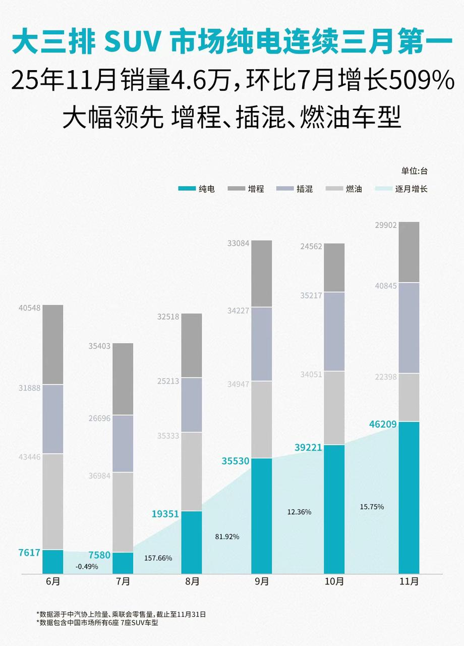 但从2025年开始,市场风向发生了转变。去年11月,纯电成为唯一同比正增长的能源形式;继 9 月首次超过增程、燃油、插混后,纯电大三排销量已连续三个月排名所有动力形式榜首。随着蔚来全新ES8销量不断破纪录,这一差距或将持续扩大。“随着技术进步和基础设施日益完善,纯电技术带来的体验收益已经大于加电不便的体验损失。在大三排SUV这一关键市场,纯电的黄金时代正在到来。”李斌在内部信中指出。