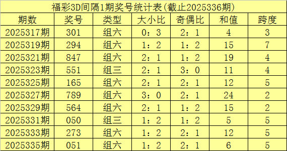 开奖回顾:福利彩票3D第25336期奖号开出641。奖号类型为组六,奇偶形态为偶偶奇,大小形态为大小小。