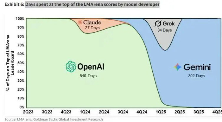 有网友统计了一张通用模型的霸榜时间图:OpenAI和谷歌已经霸榜了很长时间了,而Grok仅仅只有34天霸榜时间。