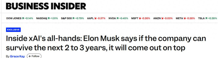 多位了解会议情况的知情人士透露,马斯克向员工表示:如果公司能够在未来两到三年内“生存下来”,xAI 最终将击败所有竞争对手,成为全球最强大的AI公司!