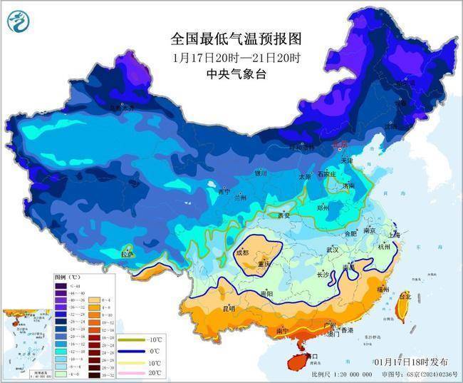 中央气象台1月17日18时继续发布寒潮蓝色预警: